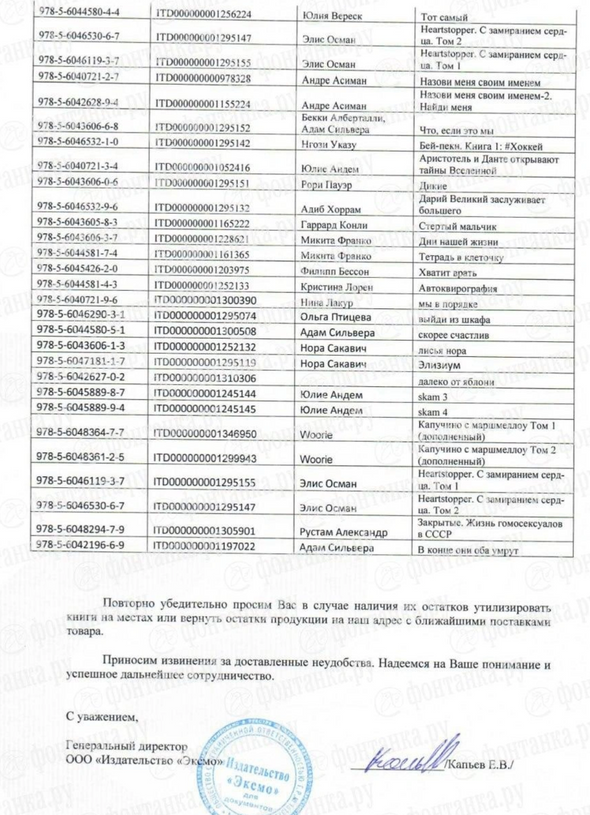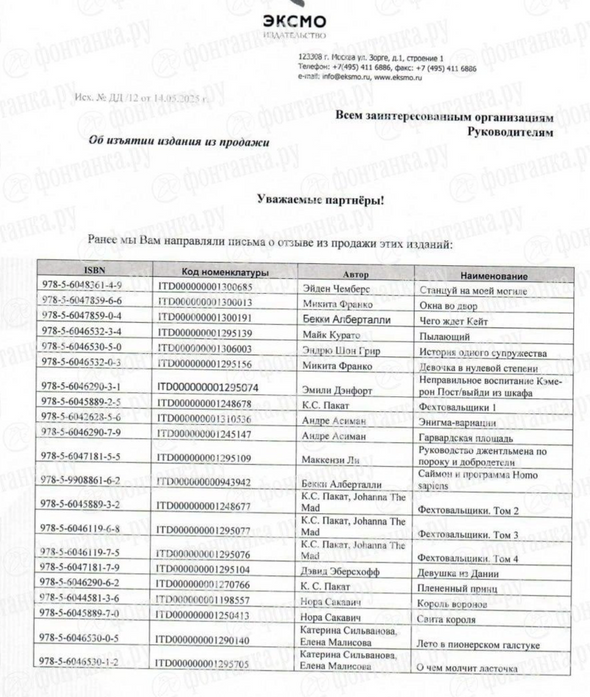 Гендиректор издательства Евгений Капьев в письме упоминает, что ранее «Эксмо» уже отзывало из продажи перечисленные книги. Однако теперь повторно просит «в случае наличия их остатков утилизировать книги на местах или вернуть остатки продукции» на адрес «Эксмо» с ближайшими поставками.