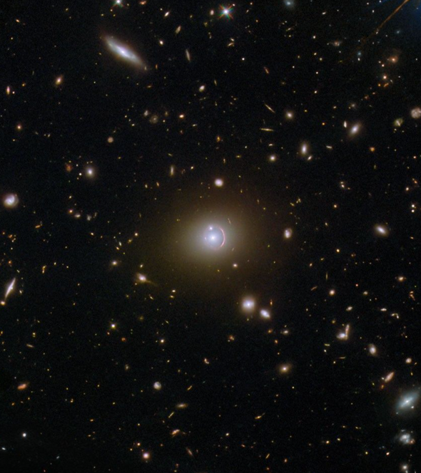 Так называемое кольцо Эйнштейна представляет собой расширенное и искаженное до кольцеобразной формы изображение сверхдальнего объекта. Их изучение помогает ученым при исследовании структур ранней Вселенной.