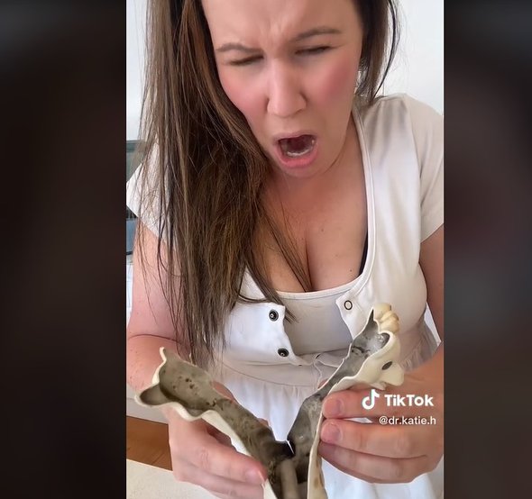 Кейти рассказала, что у сына есть свой прорезыватель, но она захотела «заглянуть» внутрь жирафа и посмотреть, не представляет ли он опасности и можно ли с ним продолжать играть. Мама взяла ножницы и разрезала жирафа пополам, от увиденного внутри побежали мурашки — внутренняя поверхность игрушки была покрыта толстым слоем черной плесени.