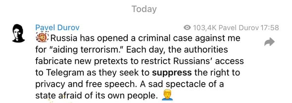 «Россия возбудила против меня уголовное дело за „пособничество терроризму“. Каждый день власти придумывают новые предлоги, чтобы ограничить доступ россиян к Telegram, стремясь подавить право на неприкосновенность частной жизни и свободу слова. Печальное зрелище государства, которое боится своего народа», — написал Дуров.