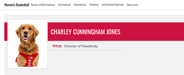 Двухлетний пес Чарли числится в составе поддержки женской баскетбольной команды университета. У него даже есть своя страница с фотографией на сайте вуза, где говорится, что Чарли — «director of pawsitivity» (игра слов: от английского paw — лапа, positivity — позитив — Прим. ред.).