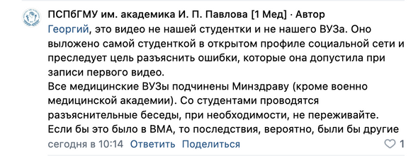 Ему ответил, по всей видимости, SMM-редактор и сотрудник ПСПбГМУ имени академика Павлова, который написал, что если бы закон высмеял кто-то из студентов ВМА (по всей видимости, имеется в виду петербургская Военно-медицинская академия им. С. М. Кирова, — примечание «Мела»), то «последствия» были бы иными.