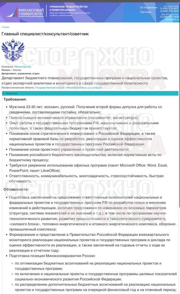 «Мужчина, русский, москвич»: Финансовый университет при правительстве РФ выложил вакансию, где главными были не образование и навыки, а пол и национальность