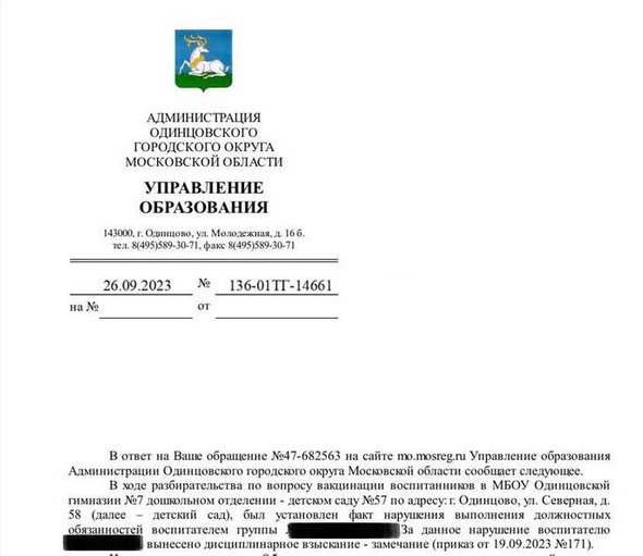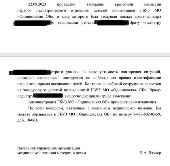 Окружное Управление образованием после произошедшего вынесло воспитателю дисциплинарное взыскание. В одинцовской областной больнице прошел внеплановый инструктаж по соблюдению правил идентификации пациентов.