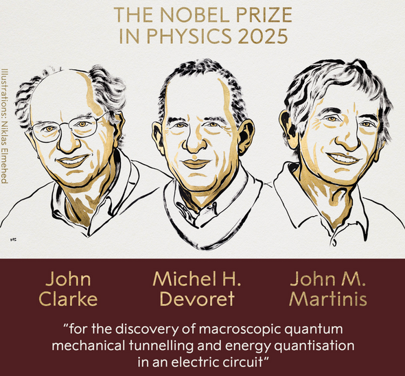 Лауреатами Нобелевской премии по физике 2025 года стали Джон Кларк, Мишель Деворе и Джон Мартинис за достижения в квантовой механике