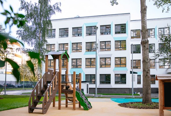 Похоже на территорию какого-нибудь ЖК, но нет — это типовой школьный двор, Москва, Митино, школа № 1190.