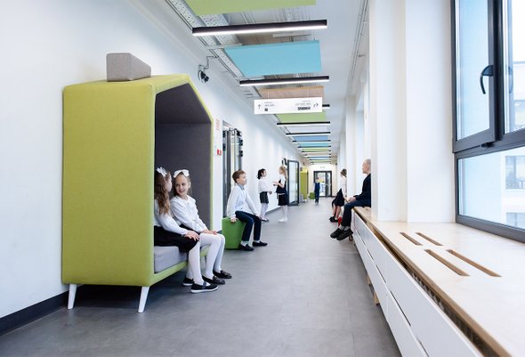 Темные, мрачные коридоры уходят в прошлое, вместо них появляются светлые пространства, где на подоконниках можно сидеть (легально), а на стенах — рисовать (абсолютно законно). Подоконники просто расширили и оборудовали на них скамейки, а на стены повесили магнитные доски — маркеры или стикеры в распоряжении учеников.
