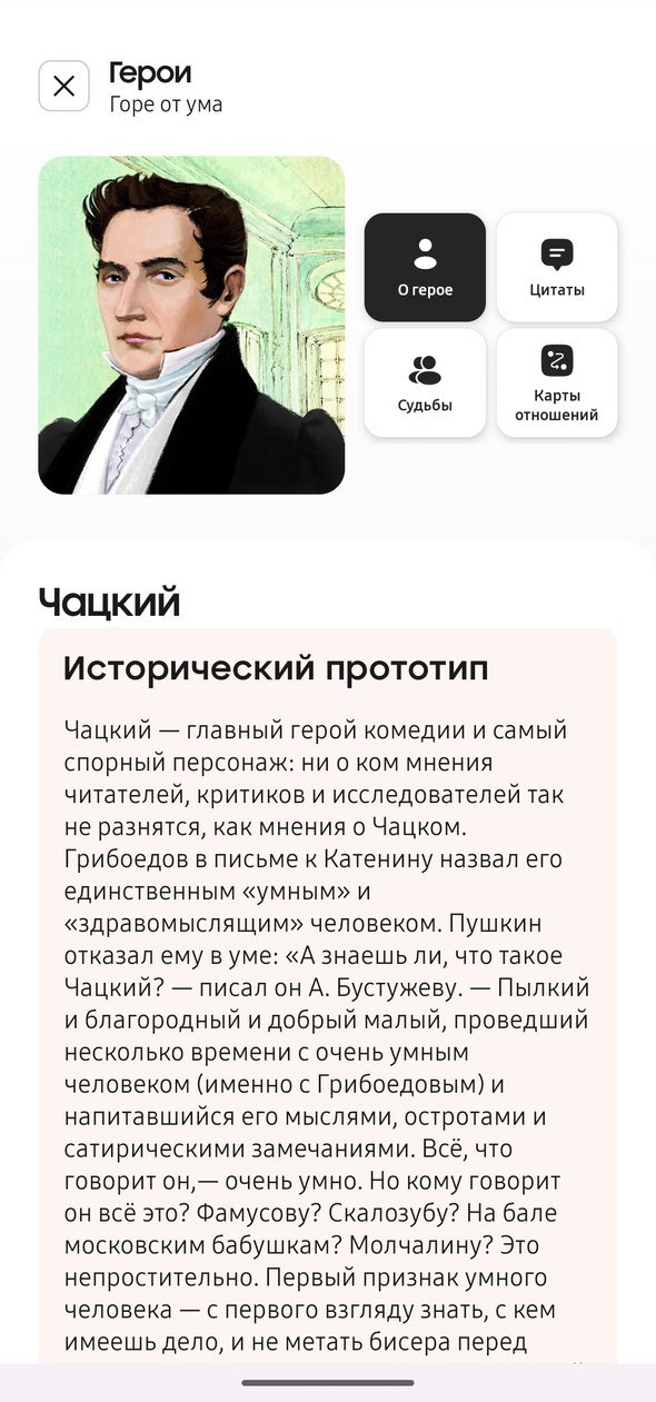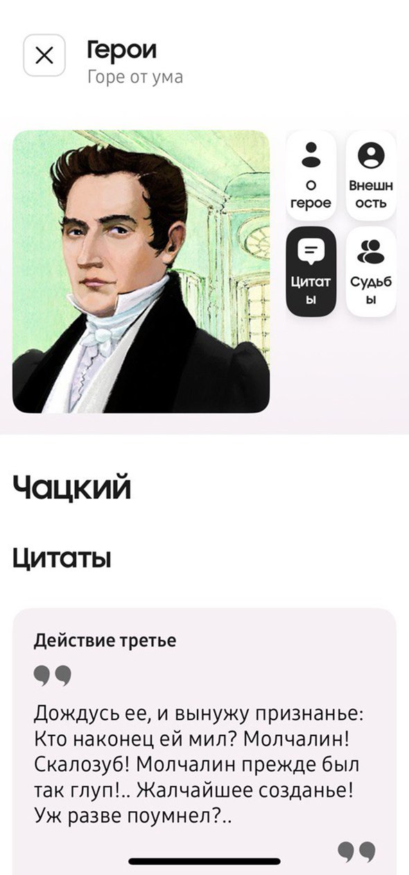 В приложении Samsung Живые страницы, помимо всего перечисленного, можно найти еще и информацию о прототипах каждого персонажа. Вы, например, знали, что для образа Свидригайлова Достоевский взял черты Ивана Грозного, о чем сделал пометки в черновиках романа? А Александр Андреевич Чацкий — это трагикомическое зеркало друзей-декабристов Грибоедова.