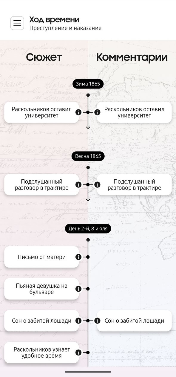А можно скачать приложение Samsung Живые страницы, где вся эта работа уже проделана за вас. Причем в приложении это можно сделать двумя способами: сразу посмотреть всю временную линию в отдельной вкладке или уже в процессе чтения переходить по цветным меткам на полях, мгновенно погружаясь в исторический контекст.