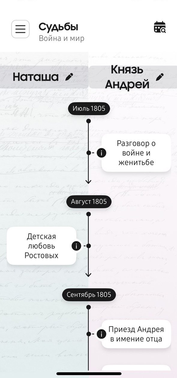 В приложении Samsung Живые страницы в блоке «Сравнить судьбы» можно проследить, например, взаимоотношения Наташи Ростовой и Пьера Безухова (или князя Андрея) или Раскольникова и Мармеладова.