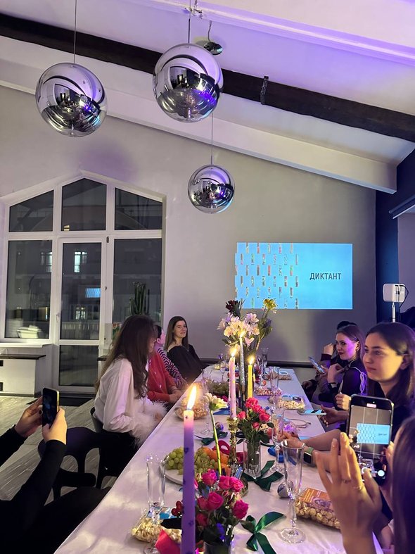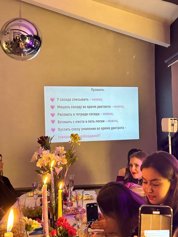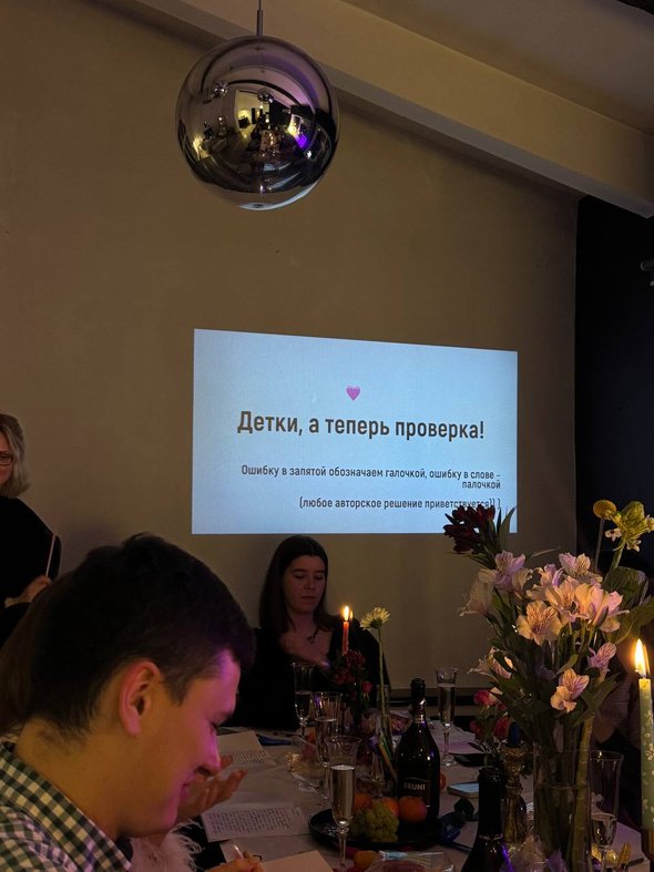 Даже в школе я никогда не проводила диктанты по методичке, мне всегда хотелось придумывать их самой — под тех, кто передо мной сидит. Так что все диктанты я каждый раз придумываю сама. Зимой текст был про рождественское чудо, размеренный и сказочный, потому что мне хотелось, чтобы и текст, и атмосфера совпадали, ведь на столе у нас стоял лапник и горели свечи. Для диктанта весной специально подобрала помещение, в котором было много света, на столе мы расставили разные цветы в вазах, а сам текст был про любовь и гедонизм.
