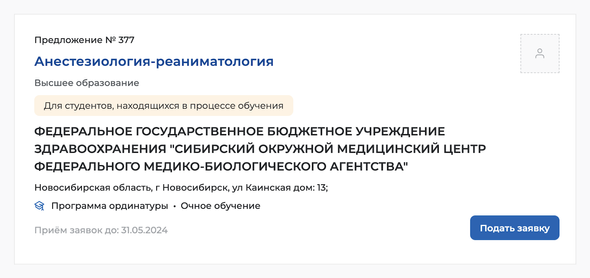 На скриншоте — пример заявки на целевое обучение в Новосибирске: программа ординатуры для студентов, которые уже обучаются в вузе. В качестве меры поддержки заказчик предлагает возместить затраты на приобретение методической и учебной литературы и санаторно-курортное лечение. После выпуска студент должен будет отработать 3 года в Сибирском окружном медицинском центре.