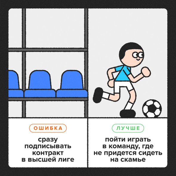 Этих контрактов не нужно бояться: редко в них встречаются какие-то подводные камни, в хороших клубах это уже отлаженная система. Но популярная ошибка, которую совершают молодые спортсмены, — это, на мой взгляд, подписание контракта с молодежным составом какого-нибудь клуба из первой профессиональной лиги в надежде, что они скоро заиграют в основном составе. На самом деле пробиться там быстро практически невозможно. И, заключая такой контракт на 2–3 года, спортсмен просто теряет время, а потом всё равно переходит во вторую-третью лигу доигрывать упущенное.