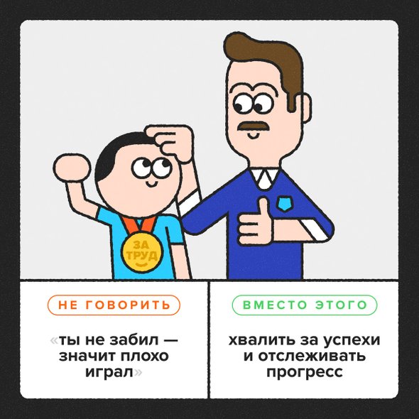 Поэтому тренерам и родителям важно создавать атмосферу, направленную на достижение мастерства, а не конкретных результатов. Для этого лучше снизить значимость победы, а акцент делать на развитии навыков, мастерства, ощущении принадлежности к команде. Хвалить ребенка не за результат, а за приложенные усилия, прогресс.