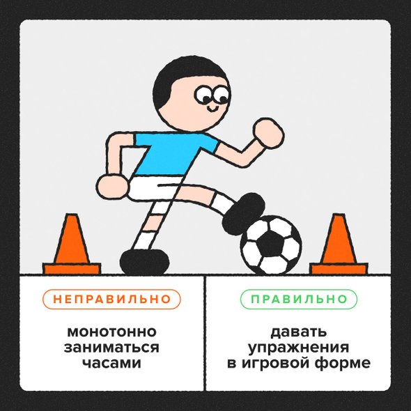 Сам по себе возраст мало что значит: начать заниматься футболом можно хоть в 4, хоть в 24 года. Но когда вы работаете с маленькими детьми, важно понимать, что в 4 года ребенку постоянно нужно разнообразие: если его запустить в комнату, полную игрушек, он будет переходить от игрушки к игрушке, бросая каждую новую через пару минут игры. Здесь тренеру важно следовать принципу «повторения без повторения»: закреплять какие-то упражнения, но каждый раз по-новому, в игровой форме. И дать поиграть на разных позициях, чтобы выяснить, что ребенку действительно по душе.
