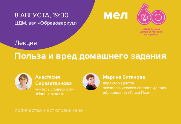 Если вы по какой-то причине не были ещё на наших лекциях — август самое время это исправить. 8 августа в Центральном детском магазине учитель словесности Анастасия Серазетдинова и психолог Марина Битянова расскажут, как делать домашнее задание, чтобы всей семье не сойти с ума. Вход как всегда бесплатный по регистрации. Приходите!