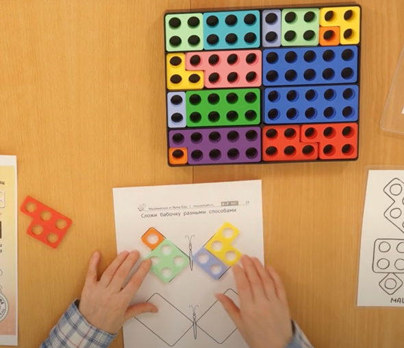 В пособии нумикон числа от 1 до 10 представлены в виде форм-шаблонов — каждое число соответствует определенным форме и цвету. Так числа становятся более доступными для ребенка.