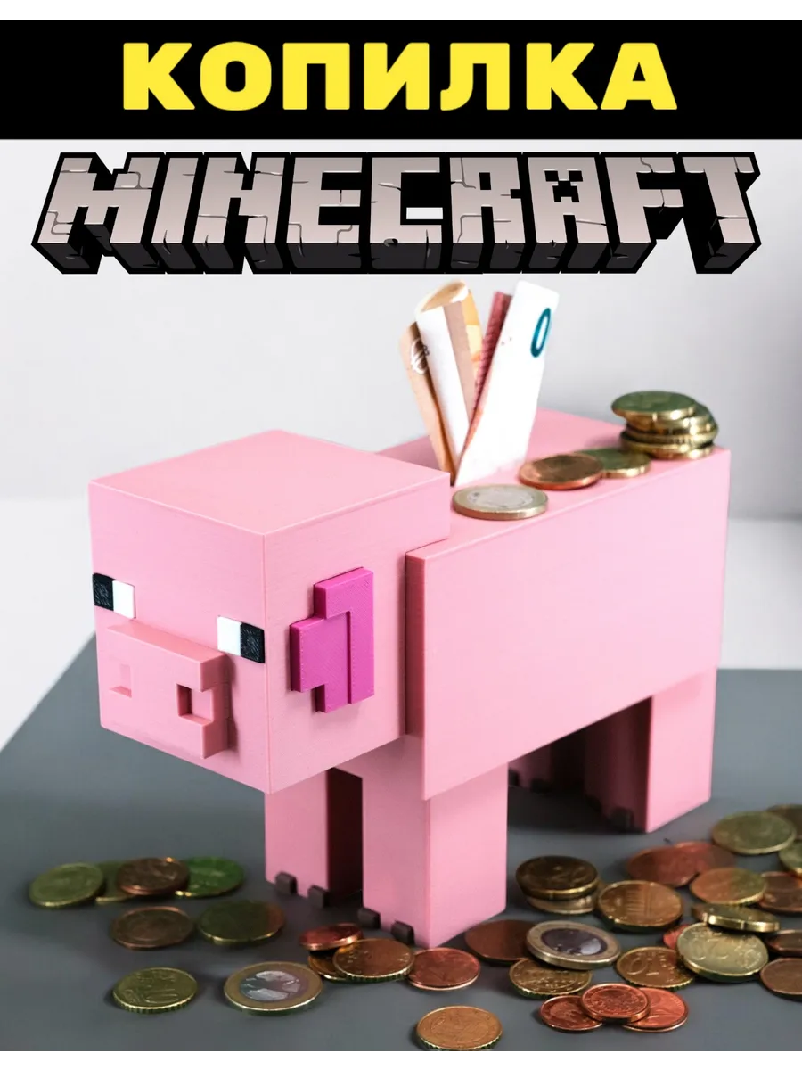 Тот самый поросенок из Minecraft, знакомый каждому ребенку, который хоть раз запускал игру. Знакомая форма и пиксельный дизайн сразу отсылают к игровому мобу — такой формат хорошо работает для школьников: копилка не выглядит «детской», но остается понятной и приятной в использовании.
