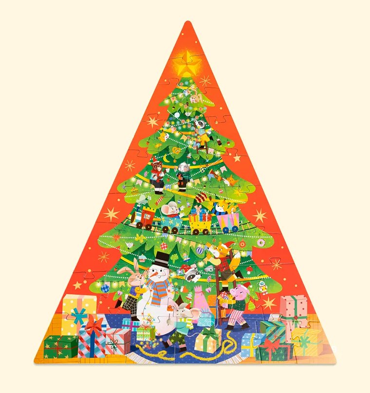 Здесь 34 детали, которые нужно сложить в картину предновогоднего буйства. И увидеть, как зверята наряжают елку, пускают по веткам железнодорожные пути, лепят снеговика и вообще подают пример слаженной работы. На примере набора можно показать ребенку, что такое пазлы. Хорошие пазлы.