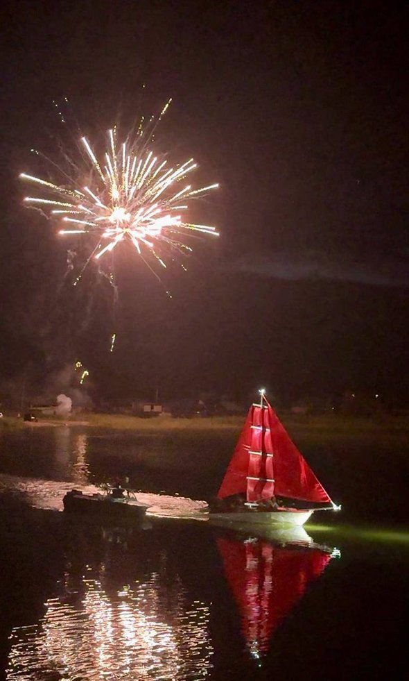 Сначала было темно и непонятно, а потом вдалеке начало появляться что-то алое, потом включились фонарики. «Смотрите, смотрите, это алые паруса!» — раздался гул. Все замерли и заворожено смотрели на корабль. В это время я тихонечко позвонила мужу, чтобы он запускал салют. Дети завизжали, закричали, а мы с мамами, которые делали этот сюрприз, со слезами на глазах обнялись и закричали: «Ура, мы это сделали!» Неописуемые эмоции. Родители были тоже удивлены, все начали снимать видео и сразу выкладывать в социальные сети.