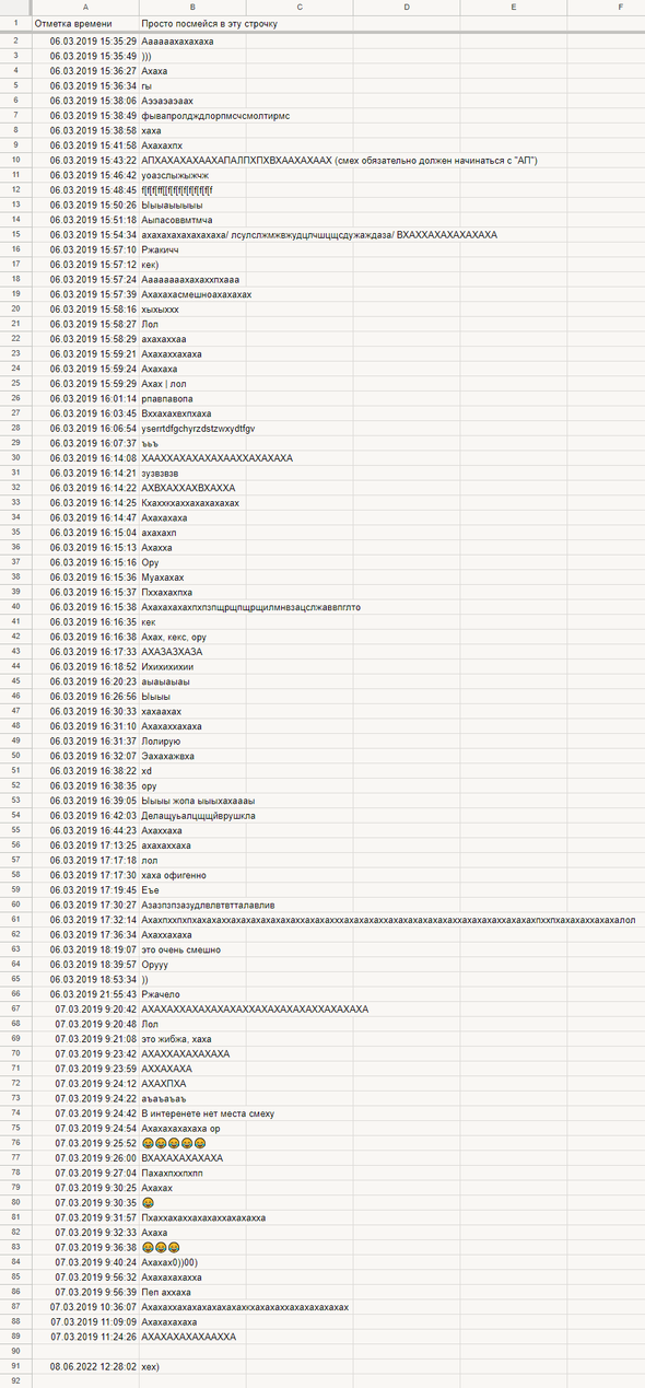 Я долго не могла придумать тему, но потом решила исследовать язык в интернет-пространстве. И мне на ум не пришло ничего лучше, кроме как сделать Google-форму, в которой я предлагала посмеяться. Суть в том, что у меня на факультете многие смеялись в переписке непонятным набором букв, будто бы кто-то просто ударил по клавиатуре (я до сих пор так порой делаю, и люди не понимают, что я имею в виду смех). Поэтому я решила проанализировать, как смех в интернете коррелирует с реальным смехом, отсылает ли это к какому-то звуку или мимике человека. В общем, главный вопрос моей работы — почему люди в интернете смеются так, как смеются.