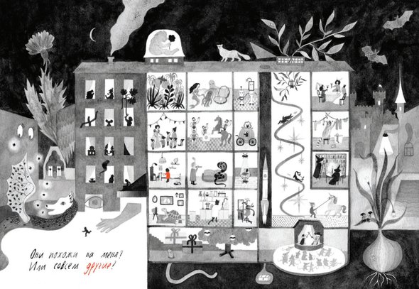 Другой пример влияния контекста на восприятие — книга Каси Денисевич «Соседи», вышедшая в издательстве «Карьера Пресс» в 2021 году. В ней есть немного текста, но сотворчеству автора и читателя он не мешает и в целом позволяет сохранить гибкость и многогранность «тихой книги».