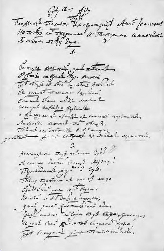 Почти всё, что мы знаем из «стихов» (то есть нерифмованной тонической поэзии) XVI–XVII веков, связано или с религией, или с политикой, и притом анонимно. Однако есть исключение. До нас дошли черновики одного поэта, относящиеся уже к самому концу века (1696–1699 годы). Дворянин Пётр Квашнин-Самарин (1671–1749), впоследствии успешный чиновник, на обрывках хозяйственных бумаг записывал малороссийские песни, сообщённые кем-то из слуг, перемежая их собственными стихотворными опытами, например такими: