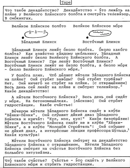 Упражнения и топики из учебника рассказывают в основном об ударниках (они работают с большим энтузиазмом), бездельниках (они курят в троллейбусах, крадут карандаши, не моются и лежат на пляжах в смокингах) и немного о муравьях и тиграх (они в основном страдают). Все эти персонажи живут в вымышленном городе Блинске и имеют прямое или косвенное отношение к производству бетона.