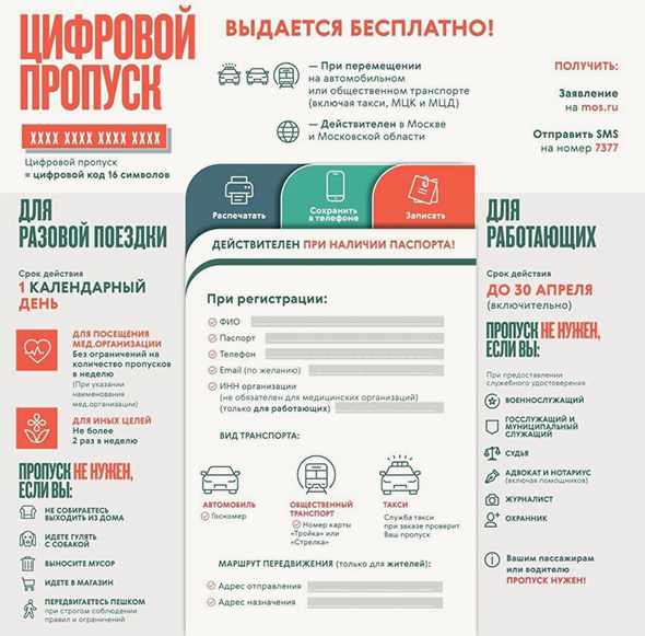 Но помним, что на сайте мэра Москвы есть четкие инструкции и пока введены пропуска трех категорий: трудовая деятельность, поездки в медицинские учреждения, личные цели, соответствующие режиму повышенной готовности (в магазин, на дачу, на вокзал и т. п.). Для каждой категории есть свой режим. Например, в магазин можно съездить два раза в неделю, а пропуск выдается на один день для поездки в пункт назначения и обратно. Читаем подробно на официальном сайте мэра.