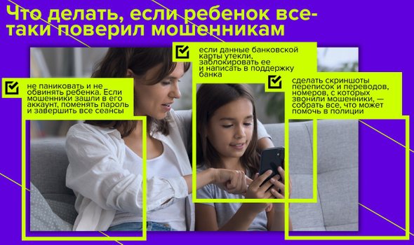 А если мошенники вышли на контакт напрямую с ребенком, например по телефону, и получили доступ к карточке или личным аккаунтам? Первое и самое важное: не паникуйте и не обвиняйте ребенка, вероятно, он и так в сильном стрессе. Поддержите его — понимание, что он не один и родитель собирается не наказать, а помочь, укрепит доверие.