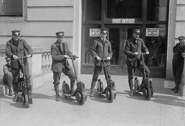 Прототипом электросамоката в 1915 году стал американский автопед. Он выглядел как увеличенная модель детского самоката с мотором перед передним колесом. Чтобы поехать, нужно было наклонить руль вперед, а чтобы затормозить — оттянуть назад. Как говорили производители, самокат мог развивать скорость почти до 50 км/час, но на самом деле никто не разгонялся больше 30 км/час. Транспорт считался игрушкой для богатых — электросамокат стоил около 100 долларов.