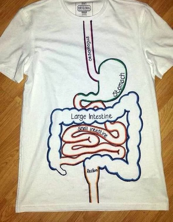 Возьмите ненужную белую футболку и нарисуйте на уровне живота строение кишечника и желудка. Для удобства напишите, как называется каждый элемент. В такой футболке гонять по дому очень прикольно. Можно использовать просто вырезанную из бумаги модель.