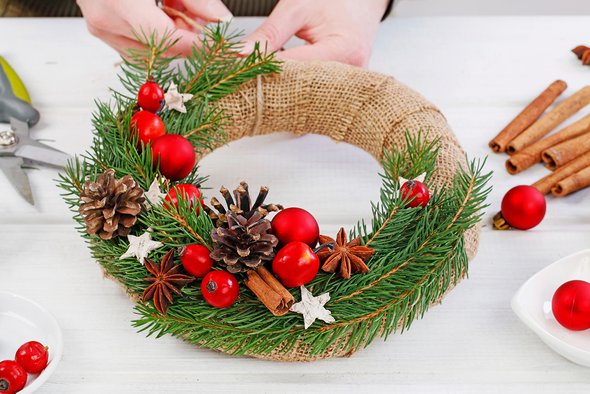 - При помощи термоклеевого пистолета крепим к получившейся основе еловые ветви, шишки, бантики, ветки рябины и другие украшения.