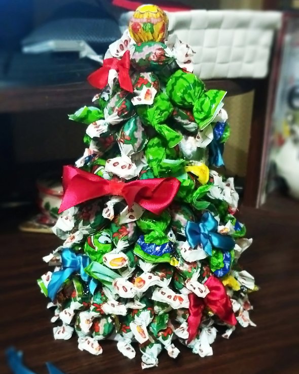 - Верхушку украшаем бантом из ленты или карамельной тростью.