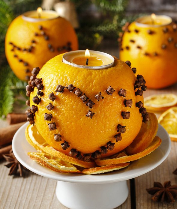 - Расставляем готовые мандарины на подносе или тарелке, ставим в них свечи, зажигаем и наслаждаемся самым новогодним ароматом.