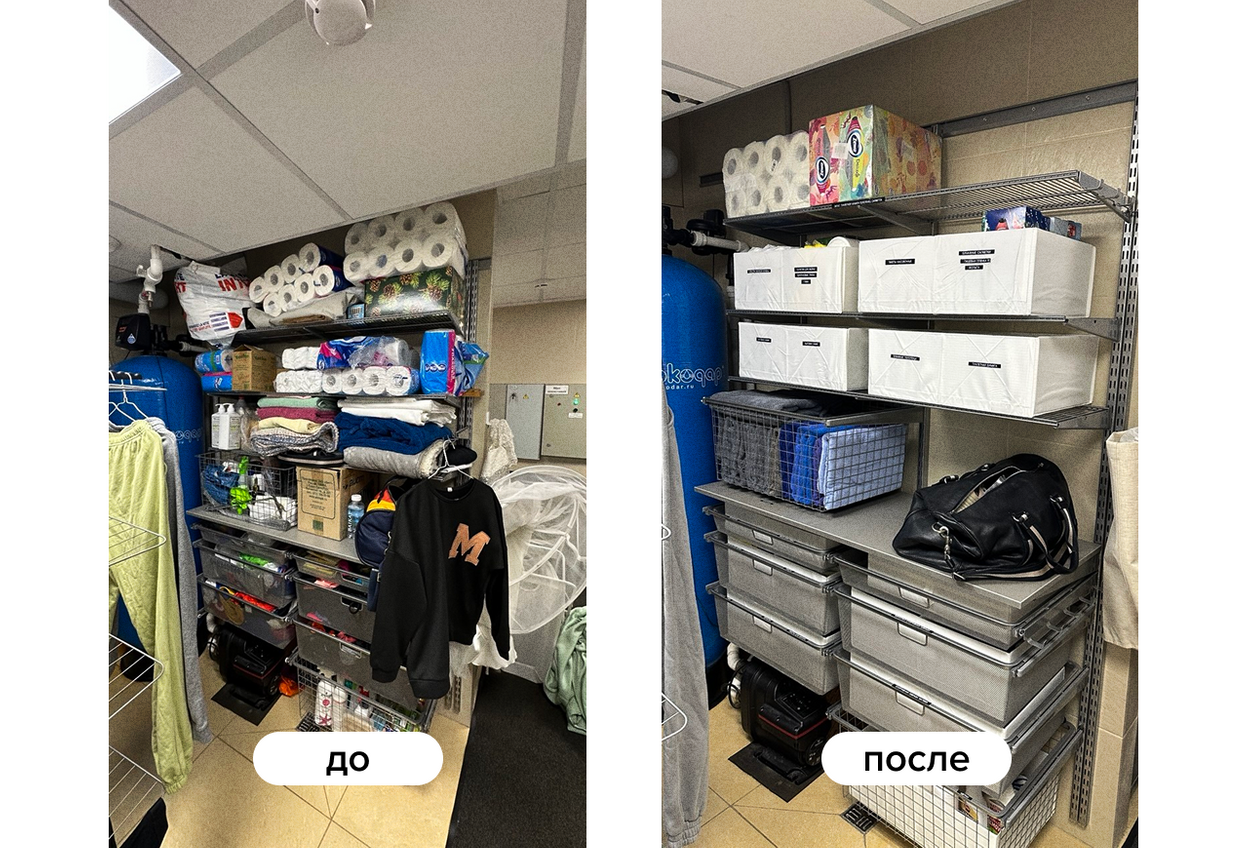 Мы абсолютно всё подписываем — все ящики, банки, полки, папки. Маркировка нужна, чтобы человеку было легко ориентироваться первое время и чтобы членам семьи было понятно, где что лежит. Мы записываем пояснительное видео, куда что убрано. На следующий день у клиента часто начинается игра «найди, что куда убрали», но это нормально. Обычно, чтобы привыкнуть к новой системе хранения, хватает двух-трех дней.