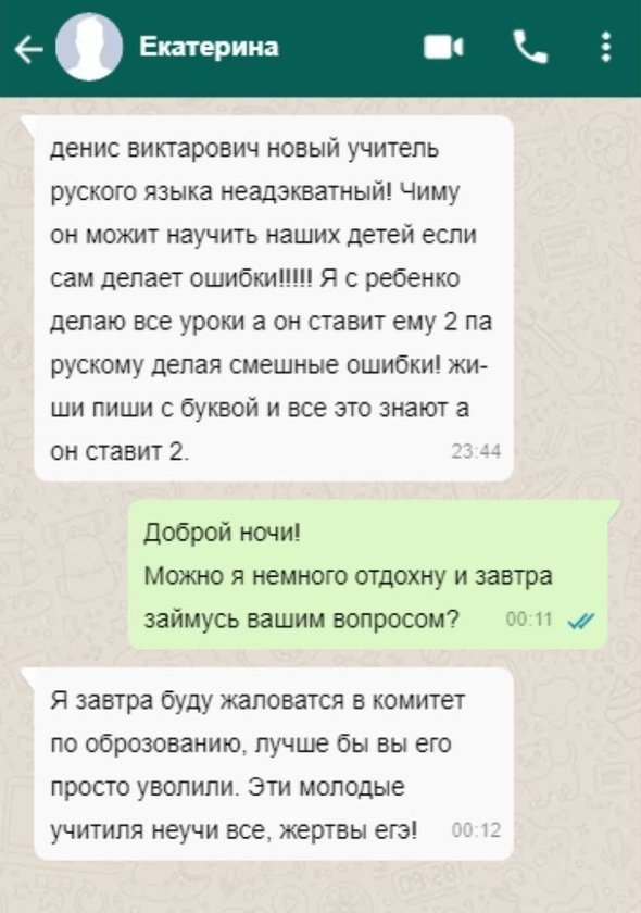 Родители сейчас ограниченные, неадекватные, развращенные, и необразованные, с полным отсутствием критического, логического мышления! Им размножаться нельзя! Что происходит с нашим обществом!!! А дальше, похоже, будет ещё хуже!!! Полная деградация и дегенерация! Надо запретить на уровне государства родителям жаловаться на учителей! Государство просто обязано нас защищать от откровенных шизофреников!!! Скоро работать в школах некому будет! Нам постоянно угрожают со всех сторон! Работать в школе — себя не уважать! Буду увольняться.