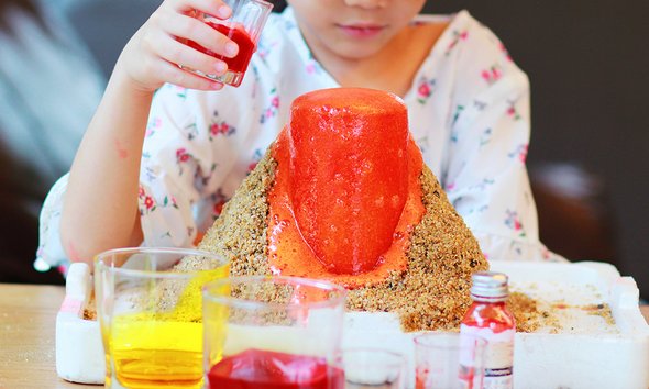 Чтобы вызвать извержение, добавьте в кружку несколько капель уксуса. Тогда из «жерла» появится яркая пена! Для эффекта вулкан можно украсить с помощью пластилина и картона — ну почти Везувий!
