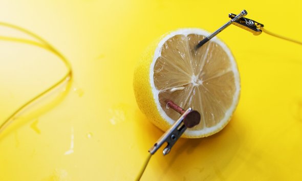 Возьмите пару лимонов и вставьте в них железки: с одной стороны скрепку, а с другой — медный проводок. Из-за реакции цинка, меди и лимонной кислоты выделится электричество! Зарядить им вряд ли что-то получится, но если взять несколько фруктов и соединить проводками, можно зажечь небольшой светодиод.