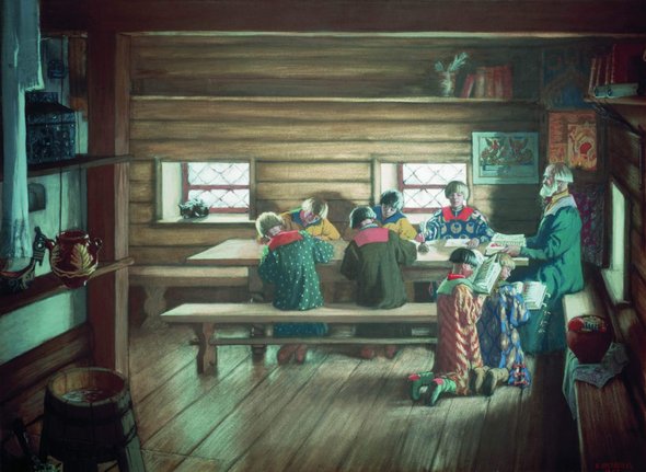 На картине Бориса Кустодиева изображен стандартный урок в земской школе, где на одного учителя обычно приходилось по 6–12 учеников. Пятеро детей что-то пишут, еще двое читают книги вслух, стоя на коленях, — художник изобразил популярную практику наказания того времени. Осанка и поза пожилого учителя указывают на его строгий нрав и волевой характер, а отсутствие лишних предметов в избе и натертый до блеска пол — на серьезное отношение к процессу обучения.
