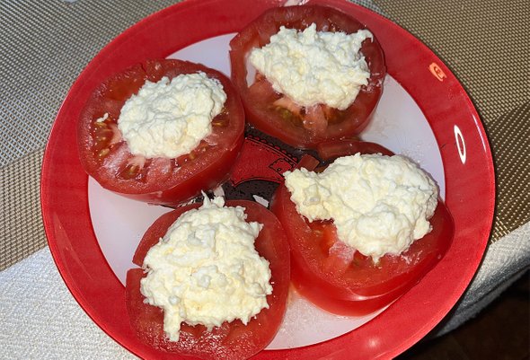 Поскольку я случайно купила чеснок вместо лука, я решила использовать его для закуски. Для намазки на самой мелкой терке натираем остатки сыра и два зубчика чеснока, выдавливаем как можно больше майонеза, всё это перемешиваем. Нарезаем крупный помидор кружочками и намазываем на них получившуюся массу. Ужин готов, приятного аппетита! Обязательно поделитесь с соседками.