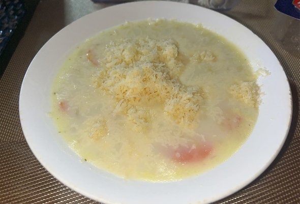 - Наливаем суп в тарелку и натираем в нее как можно больше сыра. Ждем, пока он расплавится, — и вуаля! Суп готов.