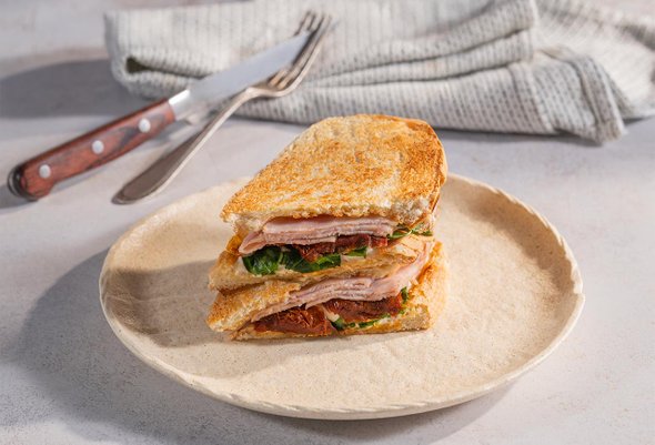 - Собираем сэндвич: тостовый хлеб смазываем любимым соусом (мои дети любят дижонскую горчицу или сладкий брусничный соус), укладываем ветчину из индейки, дальше лист салата, огурчики, ломтик сыра, помидоры — и закрываем вторым кусочком хлеба.